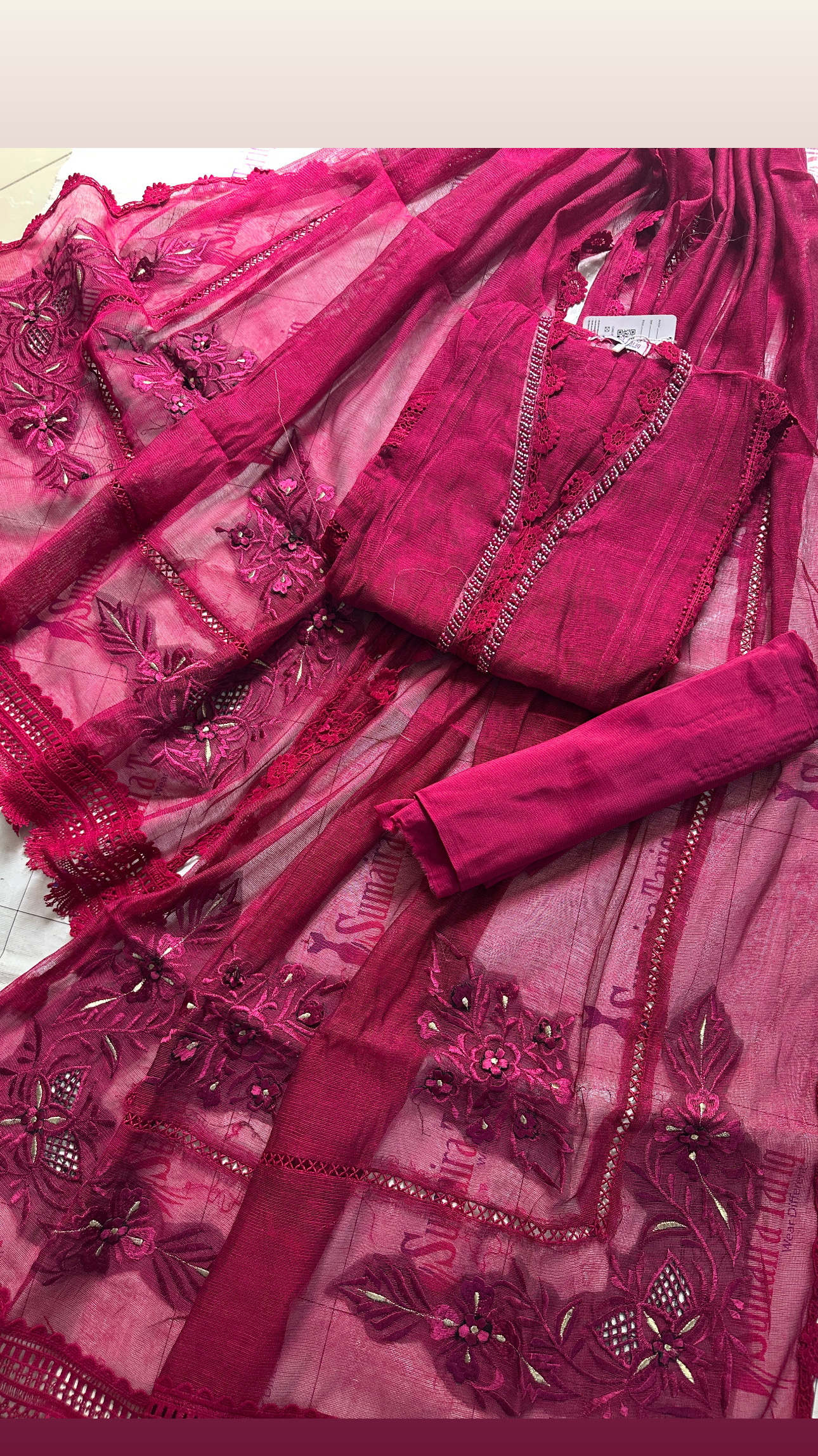 Duppata: 2.75 yards ready to wear khadinet duppata with elegant laces and cutwork.