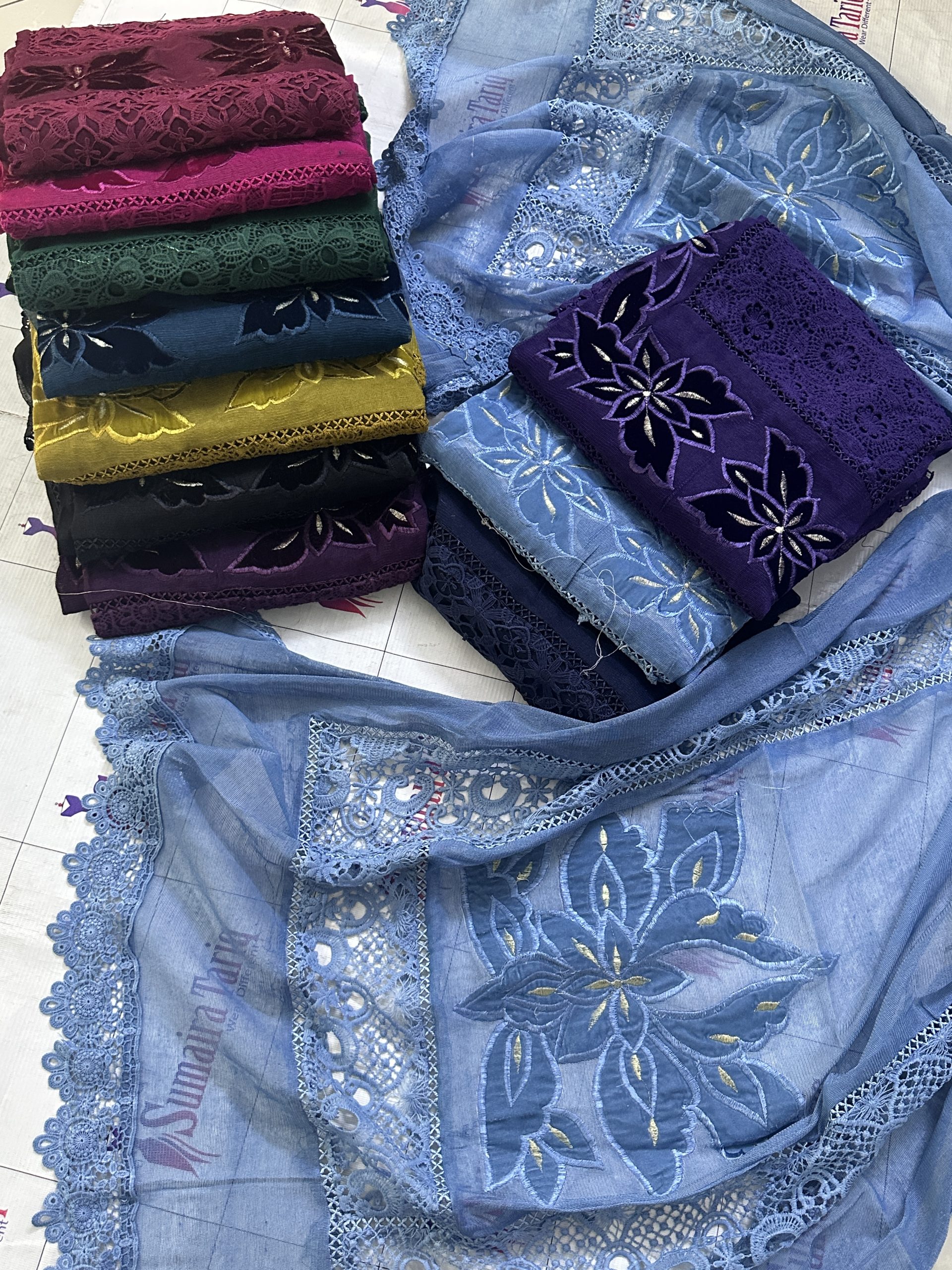 Shirt: Khaddinet and crochet semistitched embellished with Resham,and velvet applic sides are open easy to make small to xxl.