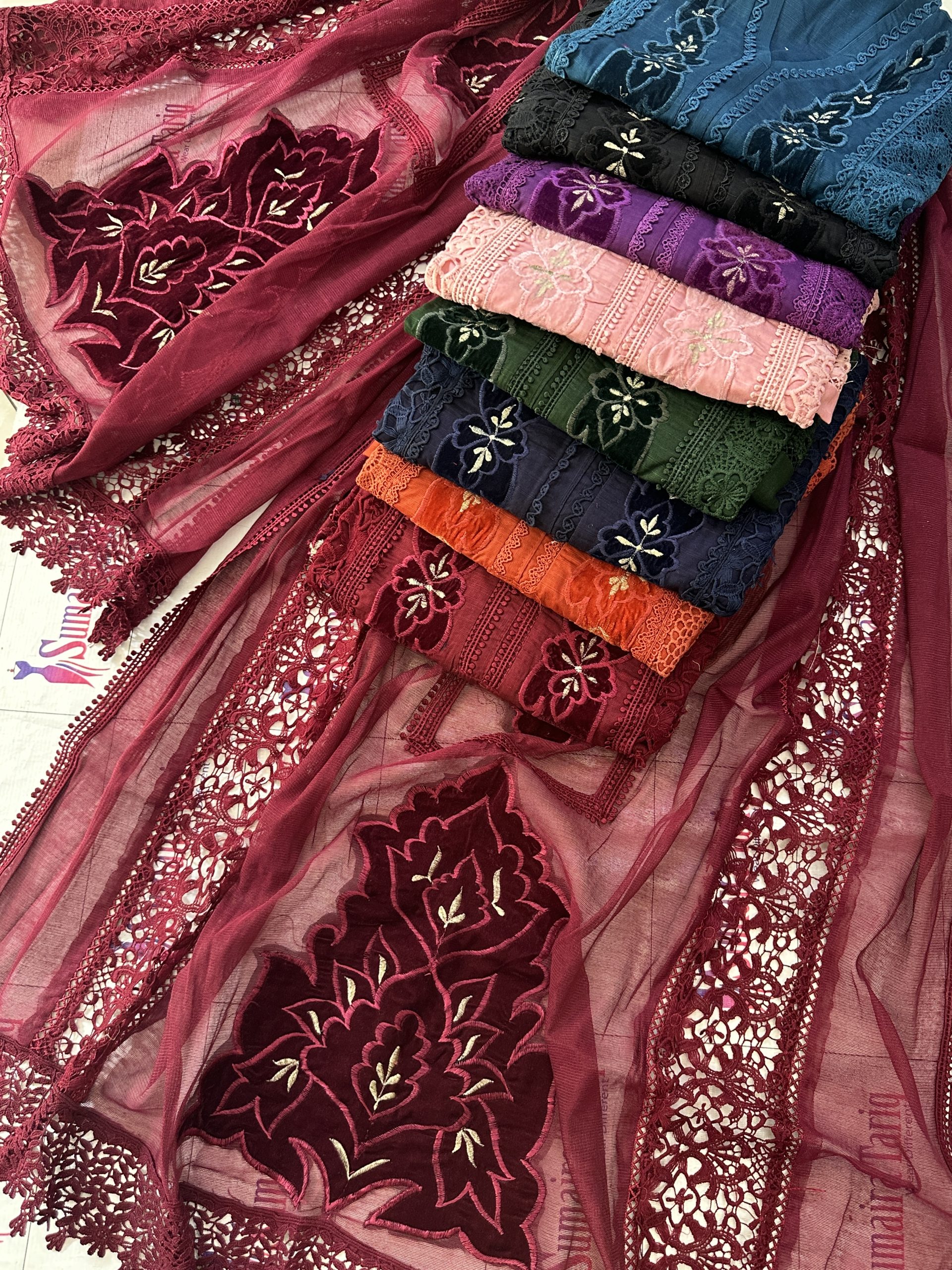 Duppata: ready to wear khaadi net duppata with laces,and velvet applic work.